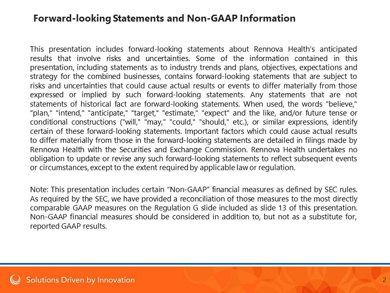 This presentation includes forward - looking statements about Rennova Health’s anticipated results that involve risks and uncertainties . Some of the information contained in this presentation, including statements as to industry trends and plans, objectives, expectations and strategy for the combined businesses, contains forward - looking statements that are subject to risks and uncertainties that could cause actual results or events to differ materially from those expressed or implied by such forward - looking statements . Any statements that are not statements of historical fact are forward - looking statements . When used, the words "believe," "plan," "intend," "anticipate," "target," "estimate," "expect" and the like, and/or future tense or conditional constructions ("will," "may," "could," "should," etc . ), or similar expressions, identify certain of these forward - looking statements . Important factors which could cause actual results to differ materially from those in the forward - looking statements are detailed in filings made by Rennova Health with the Securities and Exchange Commission . Rennova Health undertakes no obligation to update or revise any such forward - looking statements to reflect subsequent events or circumstances, except to the extent required by applicable law or regulation . Note : This presentation includes certain “Non - GAAP” financial measures as defined by SEC rules . As required by the SEC, we have provided a reconciliation of those measures to the most directly comparable GAAP measures on the Regulation G slide included as slide 13 of this presentation . Non - GAAP financial measures should be considered in addition to, but not as a substitute for, reported GAAP results . Forward looking Statements and Non - GAAP Information 2
