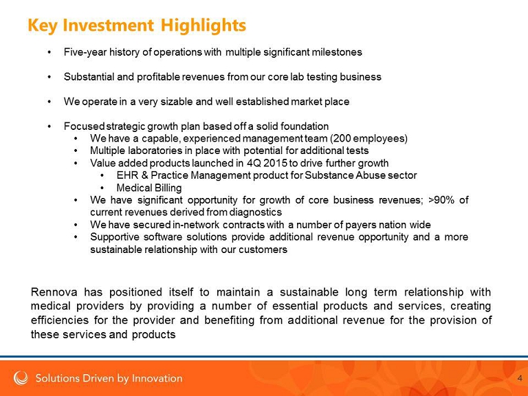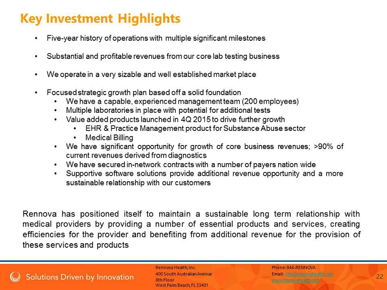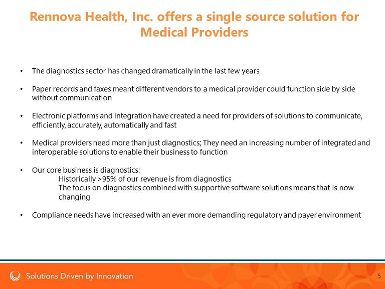Rennova Health, Inc . Phone : 844 - RENNOVA 400 South Australian Avenue Email : info@rennovahealth.com 8th Floor www.rennovahealth.com West Palm Beach, FL 33401 4 Key Investment Highlights • Five - year history of operations with multiple significant milestones • Substantial and profitable revenues from our core lab testing business • We operate in a very sizable and well established market place • Focused strategic growth plan based off a solid foundation • We have a capable, experienced management team ( 200 employees) • Multiple laboratories in place with potential for additional tests • Value added products launched in 4 Q 2015 to drive further growth • EHR & Practice Management product for Substance Abuse sector • Medical Billing • We have significant opportunity for growth of core business revenues ; > 90 % of current revenues derived from diagnostics • We have secured in - network contracts with a number of payers nation wide • Supportive software solutions provide additional revenue opportunity and a more sustainable relationship with our customers Rennova has positioned itself to maintain a sustainable long term relationship with medical providers by providing a number of essential products and services, creating efficiencies for the provider and benefiting from additional revenue for the provision of these services and products