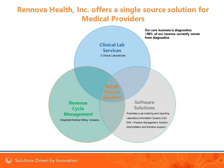 • The diagnostics sector has changed dramatically in the last few years • Paper records and faxes meant different vendors to a medical provider could function side by side without communication • Electronic platforms and integration have created a need for providers of solutions to communicate, efficiently, accurately, automatically and fast • Medical providers need more than just diagnostics; They need an increasing number of integrated and interoperable solutions to enable their business to function • Our core business is diagnostics: Historically >95% of our revenue is from diagnostics The focus on diagnostics combined with supportive software solutions means that is now changing • Compliance needs have increased with an ever more demanding regulatory and payer environment 5 Rennova Health, Inc. offers a single source solution for Medical Providers