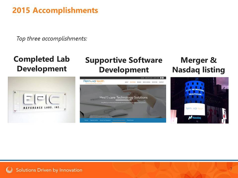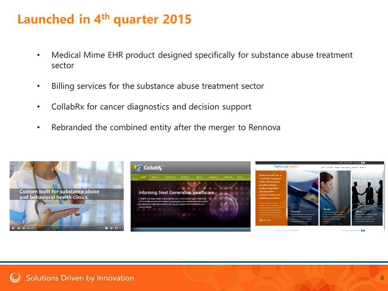 2015 Accomplishments Top three accomplishments: Merger & Nasdaq listing Supportive Software Development Completed Lab Development 7