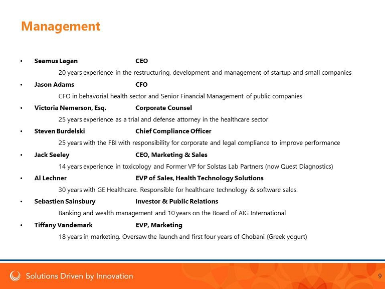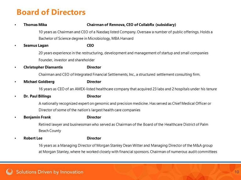 • Seamus Lagan CEO 20 years experience in the restructuring, development and management of startup and small companies • Jason Adams CFO CFO in behavorial health sector and Senior Financial Management of public companies • Victoria Nemerson, Esq. Corporate Counsel 25 years experience as a trial and defense attorney in the healthcare sector • Steven Burdelski Chief Compliance Officer 25 years with the FBI with responsibility for corporate and legal compliance to improve performance • Jack Seeley CEO, Marketing & Sales 14 years experience in toxicology and Former VP for Solstas Lab Partners (now Quest Diagnostics ) • Al Lechner EVP of Sales, Health Technology Solutions 30 years with GE Healthcare. Responsible for healthcare technology & software sales. • Sebastien Sainsbury Investor & Public Relations Banking and wealth management and 10 years on the Board of AIG International • Tiffany Vandemark EVP, Marketing 18 years in marketing. Oversaw the launch and first four years of Chobani (Greek yogurt) 9 Management