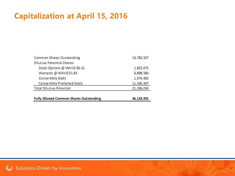 Capitalization at April 15, 2016 Common Shares Outstanding 14,782,557 Dilutive Potential Shares: Stock Options @ WAVG $6.41 1,822,675 Warrants @ WAVG $1.83 6,898,560 Convertible Debt 1,074,402 Convertible Preferred Stock 11,540,397 Total Dilutive Potential 21,336,034 Fully Diluted Common Shares Outstanding 36,118,591 12