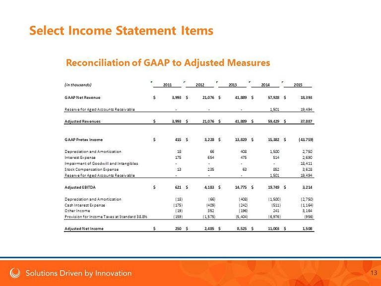 13 (in thousands) 2011 2012 2013 2014 2015 GAAP Net Revenue 3,993$ 21,076$ 41,889$ 57,928$ 18,393$ Reserve for Aged Accounts Receivable - - - 1,501 19,494 Adjusted Revenues 3,993$ 21,076$ 41,889$ 59,429$ 37,887$ GAAP Pretax Income 415$ 3,228$ 13,829$ 15,382$ (43,759)$ Depreciation and Amortization 18 66 408 1,500 2,750 Interest Expense 175 654 475 514 2,690 Impairment of Goodwill and Intangibles - - - - 18,411 Stock Compensation Expense 13 235 63 852 3,628 Reserve for Aged Accounts Receivable - - - 1,501 19,494 Adjusted EBITDA 621$ 4,183$ 14,775$ 19,749$ 3,214$ Depreciation and Amortization (18) (66) (408) (1,500) (2,750) Cash Interest Expense (175) (409) (242) (511) (1,164) Other Income (19) 352 (196) 241 3,164 Provision for Income Taxes at Standard 38.8% (159) (1,575) (5,404) (6,976) (956) Adjusted Net Income 250$ 2,485$ 8,525$ 11,003$ 1,508$ Select Income Statement Items Reconciliation of GAAP to Adjusted Measures