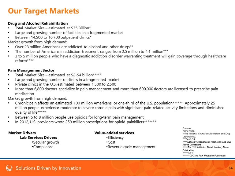 Drug and Alcohol Rehabilitation • Total Market Size – estimated at $35 Billion* • Large and growing number of facilities in a fragmented market • Between 14,500 to 16,700 outpatient clinics* Market growth from high demand: • Over 23 million Americans are addicted to alcohol and other drugs** • The number of Americans in addiction treatment ranges from 2.5 million to 4.1 million*** • 3 to 5 million people who have a diagnostic addiction disorder warranting treatment will gain coverage through healthcare reform **** Pain Management Sector • Total Market Size – estimated at $2 - $4 billion***** • Large and growing number of clinics in a fragmented market • Private clinics in the U.S. estimated between 1,500 to 2,500 • More than 6,800 doctors specialize in pain management and more than 600,000 doctors are licensed to prescribe pain medication Market growth from high demand: • Chronic pain affects an estimated 100 million Americans, or one - third of the U.S. population****** Approximately 25 million people experience moderate to severe chronic pain with significant pain - related activity limitations and diminished quality of life***** • Between 5 to 8 million people use opioids for long - term pain management • In 2012, U.S. providers wrote 259 million prescriptions for opioid painkillers******* Market Drivers Lab Services Drivers • Secular growth • Compliance Value - added services • Efficiency • Cost • Revenue cycle management 14 Sources: *IBIS World, ** The National Council on Alcoholism and Drug Dependency , *** SAMHSA , **** National Association of Alcoholism and Drug Abuse Counselors ***** The U.S. Addiction Rehab Market, Bharat Publication, ******NIH , *******CDC and Pain Physician Publication . Our Target M arkets