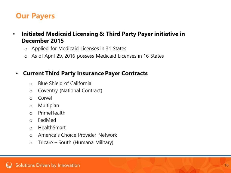16 Our Payers • Initiated Medicaid Licensing & Third Party Payer initiative in December 2015 o Applied for Medicaid Licenses in 31 States o As of April 29, 2016 possess Medicaid Licenses in 16 States • Current Third Party Insurance Payer Contracts o Blue Shield of California o Coventry (National Contract) o Corvel o Multiplan o PrimeHealth o FedMed o HealthSmart o America’s Choice Provider Network o Tricare – South (Humana Military)