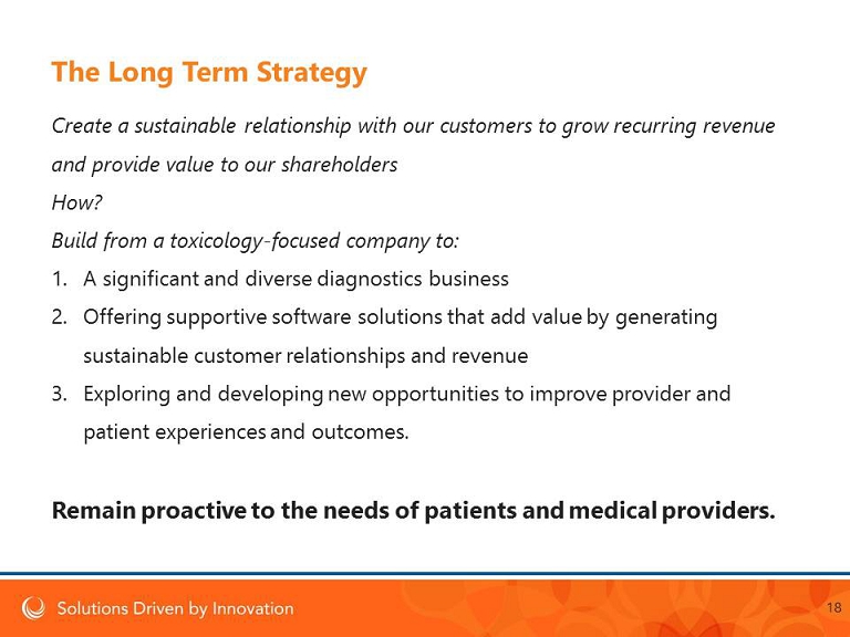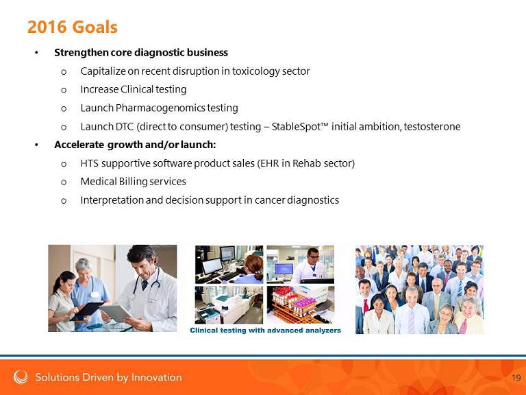 The Long Term Strategy Create a sustainable relationship with our customers to grow recurring revenue and provide value to our shareholders How? Build from a toxicology - focused company to: 1. A significant and diverse diagnostics business 2. Offering supportive software solutions that add value by generating sustainable customer relationships and revenue 3. Exploring and developing new opportunities to improve provider and patient experiences and outcomes. Remain proactive to the needs of patients and medical providers. 18