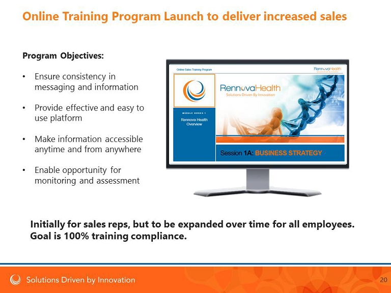 Program Objectives : • Ensure consistency in messaging and information • Provide effective and easy to use platform • Make information accessible anytime and from anywhere • Enable opportunity for monitoring and assessment Initially for sales reps, but to be expanded over time for all employees. Goal is 100% training compliance . Online Training Program Launch to deliver increased sales 20
