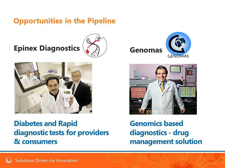 Epinex Diagnostics Opportunities in the Pipeline Genomas Genomics based diagnostics - drug management solution Diabetes and Rapid diagnostic tests for providers & consumers 21