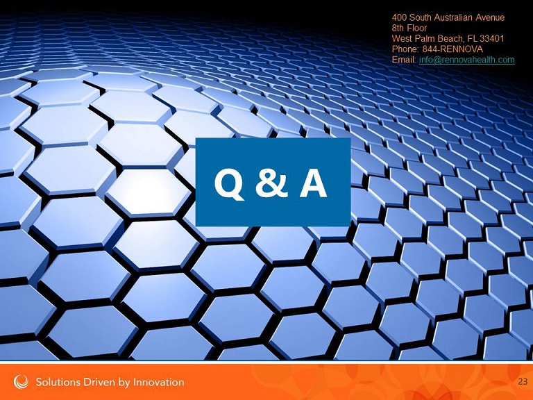 Rennova Health, Inc . Phone : 844 - RENNOVA 400 South Australian Avenue Email : info@rennovahealth.com 8th Floor www.rennovahealth.com West Palm Beach, FL 33401 22 Key Investment Highlights • Five - year history of operations with multiple significant milestones • Substantial and profitable revenues from our core lab testing business • We operate in a very sizable and well established market place • Focused strategic growth plan based off a solid foundation • We have a capable, experienced management team ( 200 employees) • Multiple laboratories in place with potential for additional tests • Value added products launched in 4 Q 2015 to drive further growth • EHR & Practice Management product for Substance Abuse sector • Medical Billing • We have significant opportunity for growth of core business revenues ; > 90 % of current revenues derived from diagnostics • We have secured in - network contracts with a number of payers nation wide • Supportive software solutions provide additional revenue opportunity and a more sustainable relationship with our customers Rennova has positioned itself to maintain a sustainable long term relationship with medical providers by providing a number of essential products and services, creating efficiencies for the provider and benefiting from additional revenue for the provision of these services and products