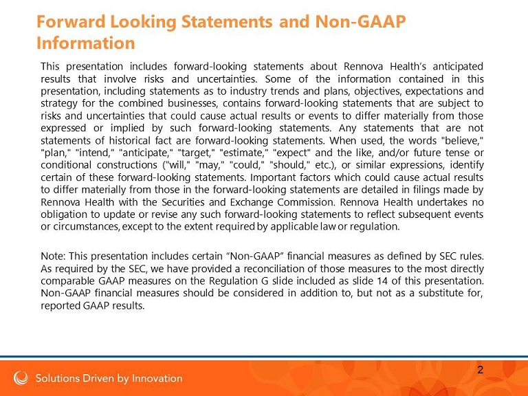This presentation includes forward - looking statements about Rennova Health’s anticipated results that involve risks and uncertainties . Some of the information contained in this presentation, including statements as to industry trends and plans, objectives, expectations and strategy for the combined businesses, contains forward - looking statements that are subject to risks and uncertainties that could cause actual results or events to differ materially from those expressed or implied by such forward - looking statements . Any statements that are not statements of historical fact are forward - looking statements . When used, the words "believe," "plan," "intend," "anticipate," "target," "estimate," "expect" and the like, and/or future tense or conditional constructions ("will," "may," "could," "should," etc . ), or similar expressions, identify certain of these forward - looking statements . Important factors which could cause actual results to differ materially from those in the forward - looking statements are detailed in filings made by Rennova Health with the Securities and Exchange Commission . Rennova Health undertakes no obligation to update or revise any such forward - looking statements to reflect subsequent events or circumstances, except to the extent required by applicable law or regulation . Note : This presentation includes certain “Non - GAAP” financial measures as defined by SEC rules . As required by the SEC, we have provided a reconciliation of those measures to the most directly comparable GAAP measures on the Regulation G slide included as slide 15 of this presentation . Non - GAAP financial measures should be considered in addition to, but not as a substitute for, reported GAAP results . Forward Looking Statements and Non - GAAP Information 2