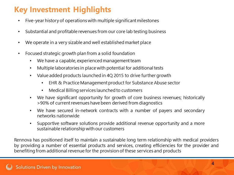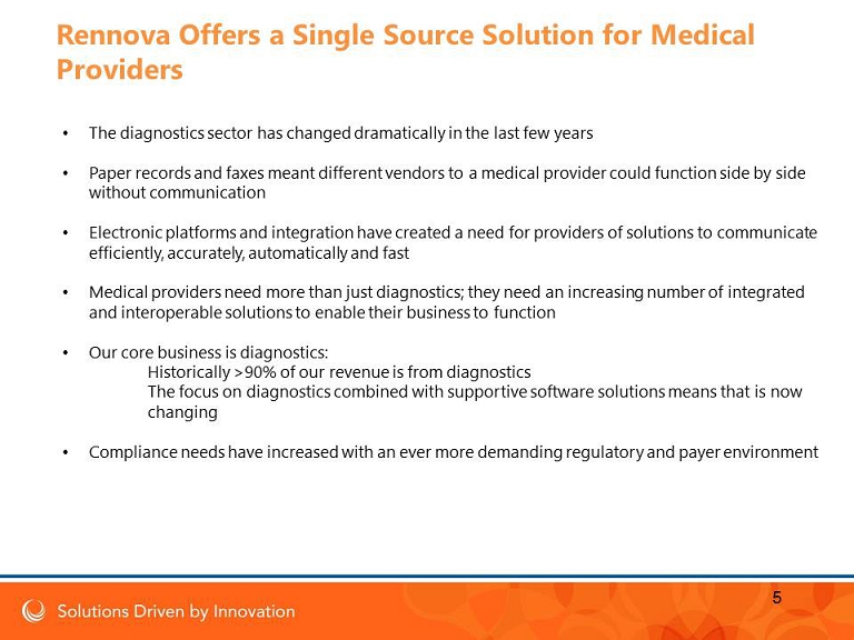 • Five - year history of operations with multiple significant milestones • Substantial and profitable revenues from our core lab testing business • We operate in a very sizable and well established market place • Focused strategic growth plan from a solid foundation • We have a capable, experienced management team • Multiple laboratories in place with potential for additional tests • Value added products launched in 4 Q 2015 to drive further growth • EHR & Practice Management product for Substance Abuse sector • Medical Billing services launched to customers • We have significant opportunity for growth of core business revenues ; historically > 90 % of current revenues have been derived from diagnostics • We have secured in - network contracts with a number of payers and secondary networks nationwide • Supportive software solutions provide additional revenue opportunity and a more sustainable relationship with our customers Rennova has positioned itself to maintain a sustainable long term relationship with medical providers by providing a number of essential products and services, creating efficiencies for the provider and benefiting from additional revenue for the provision of these services and products 4 Key Investment Highlights