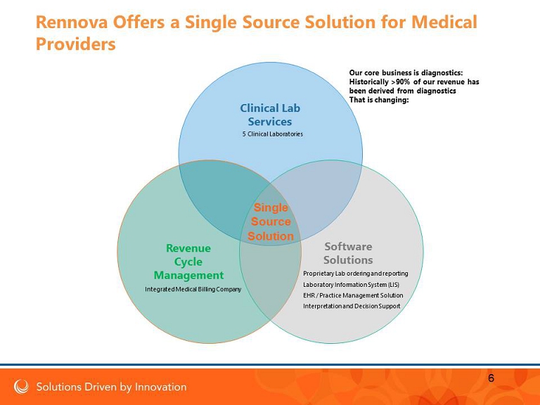 • The diagnostics sector has changed dramatically in the last few years • Paper records and faxes meant different vendors to a medical provider could function side by side without communication • Electronic platforms and integration have created a need for providers of solutions to communicate efficiently, accurately, automatically and fast • Medical providers need more than just diagnostics; they need an increasing number of integrated and interoperable solutions to enable their business to function • Our core business is diagnostics: Historically >90% of our revenue is from diagnostics The focus on diagnostics combined with supportive software solutions means that is now changing • Compliance needs have increased with an ever more demanding regulatory and payer environment 5 Rennova Offers a Single Source Solution for Medical Providers