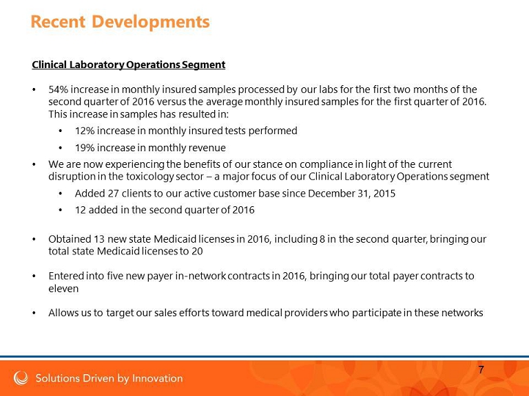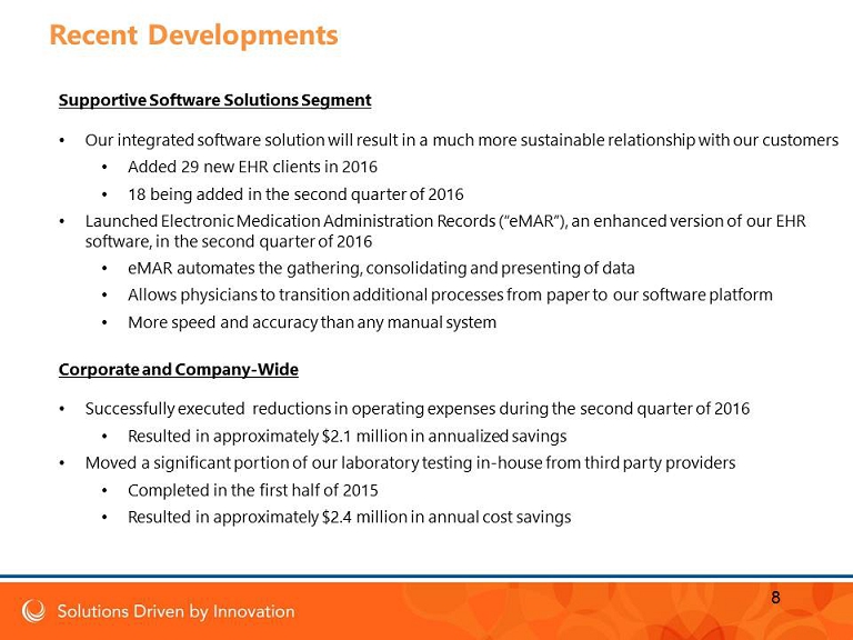 Clinical Laboratory Operations Segment • 54% increase in monthly insured samples processed by our labs for the first two months of the second quarter of 2016 versus the average monthly insured samples for the first quarter of 2016. This increase in samples has resulted in: • 12% increase in monthly insured tests performed • 19% increase in monthly revenue • We are now experiencing the benefits of our stance on compliance in light of the current disruption in the toxicology sector – a major focus of our Clinical Laboratory Operations segment • Added 27 clients to our active customer base since December 31, 2015 • 12 added in the second quarter of 2016 • Obtained 13 new state Medicaid licenses in 2016, including 8 in the second quarter, bringing our total state Medicaid licenses to 20 • Entered into five new payer in - network contracts in 2016, bringing our total payer contracts to eleven • Allows us to target our sales efforts toward medical providers who participate in these networks 7 Recent Developments