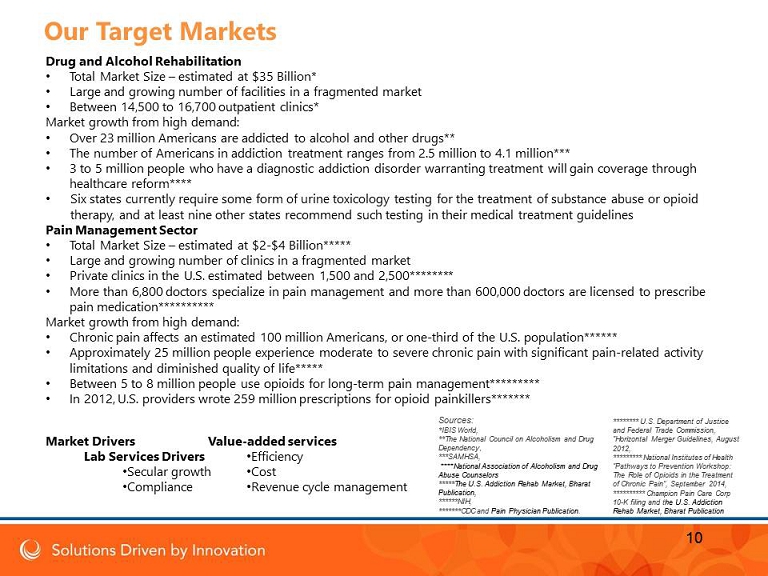 Drug and Alcohol Rehabilitation • Total Market Size – estimated at $35 Billion* • Large and growing number of facilities in a fragmented market • Between 14,500 to 16,700 outpatient clinics* Market growth from high demand: • Over 23 million Americans are addicted to alcohol and other drugs** • The number of Americans in addiction treatment ranges from 2.5 million to 4.1 million*** • 3 to 5 million people who have a diagnostic addiction disorder warranting treatment will gain coverage through healthcare reform**** • Six states currently require some form of urine toxicology testing for the treatment of substance abuse or opioid therapy, and at least nine other states recommend such testing in their medical treatment guidelines Pain Management Sector • Total Market Size – estimated at $2 - $4 Billion***** • Large and growing number of clinics in a fragmented market • Private clinics in the U.S. estimated between 1,500 and 2,500******** • More than 6,800 doctors specialize in pain management and more than 600,000 doctors are licensed to prescribe pain medication********** Market growth from high demand: • Chronic pain affects an estimated 100 million Americans, or one - third of the U.S. population****** • Approximately 25 million people experience moderate to severe chronic pain with significant pain - related activity limitations and diminished quality of life***** • Between 5 to 8 million people use opioids for long - term pain management********* • In 2012, U.S. providers wrote 259 million prescriptions for opioid painkillers******* Market Drivers Lab Services Drivers • Secular growth • Compliance Value - added services • Efficiency • Cost • Revenue cycle management Sources: *IBIS World, **The National Council on Alcoholism and Drug Dependency , ***SAMHSA, **** National Association of Alcoholism and Drug Abuse Counselors ***** The U.S. Addiction Rehab Market, Bharat Publication, ******NIH, *******CDC and Pain Physician Publication . 10 Our Target Markets ******** U.S. Department of Justice and Federal Trade Commission, “Horizontal Merger Guidelines, August 2012, ********* National Institutes of Health “Pathways to Prevention Workshop: The Role of Opioids in the Treatment of Chronic Pain”, September 2014, ********** Champion Pain Care Corp 10 - K filing and t he U.S. Addiction Rehab Market, Bharat Publication
