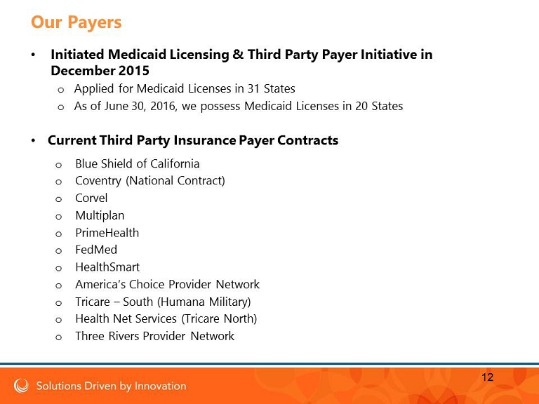 • Initiated Medicaid Licensing & Third Party Payer Initiative in December 2015 o Applied for Medicaid Licenses in 31 States o As of June 30, 2016, we possess Medicaid Licenses in 20 States • Current Third Party Insurance Payer Contracts o Blue Shield of California o Coventry (National Contract) o Corvel o Multiplan o PrimeHealth o FedMed o HealthSmart o America’s Choice Provider Network o Tricare – South (Humana Military) o Health Net Services (Tricare North) o Three Rivers Provider Network 12 Our Payers
