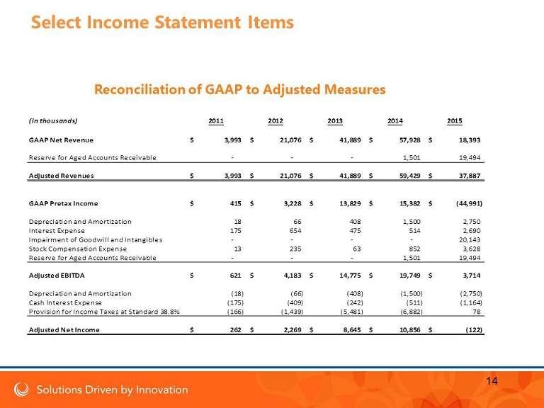 Reconciliation of Adjusted Measures to GAAP displayed on next slide 13 History in Numbers $3,993,000 $21,076,000 $41,889,000 $59,429,000 $37,887,000 $621,000 $4,183,000 $14,775,000 $19,749,000 $3,714,000 $- $10,000,000 $20,000,000 $30,000,000 $40,000,000 $50,000,000 $60,000,000 $70,000,000 2011 2012 2013 2014 2015 Adjusted Revenues Adjusted EBITDA