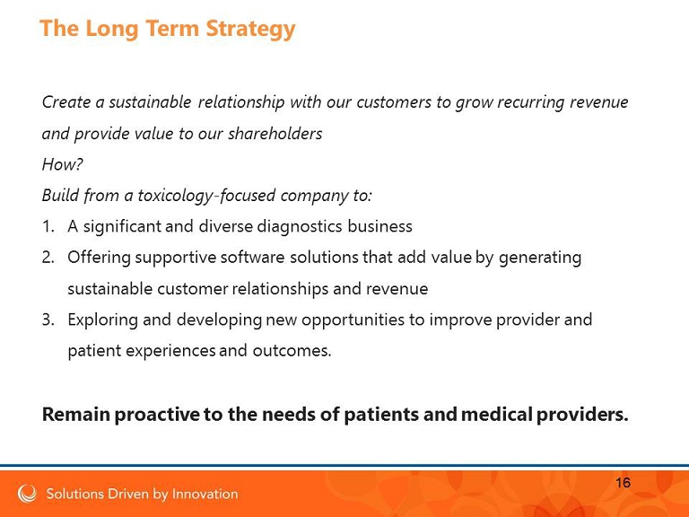 Create a sustainable relationship with our customers to grow recurring revenue and provide value to our shareholders How? Build from a toxicology - focused company to: 1. A significant and diverse diagnostics business 2. Offering supportive software solutions that add value by generating sustainable customer relationships and revenue 3. Exploring and developing new opportunities to improve provider and patient experiences and outcomes. Remain proactive to the needs of patients and medical providers. 16 The Long Term Strategy