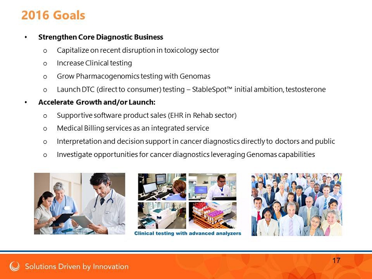 • Strengthen Core Diagnostic Business o Capitalize on recent disruption in toxicology sector o Increase Clinical testing o Grow Pharmacogenomics testing with Genomas o Launch DTC (direct to consumer) testing – StableSpot ™ initial ambition, testosterone • Accelerate Growth and/or Launch: o Supportive software product sales (EHR in Rehab sector) o Medical Billing services as an integrated service o Interpretation and decision support in cancer diagnostics directly to doctors and public o Investigate opportunities for cancer diagnostics leveraging Genomas capabilities 17 2016 Goals