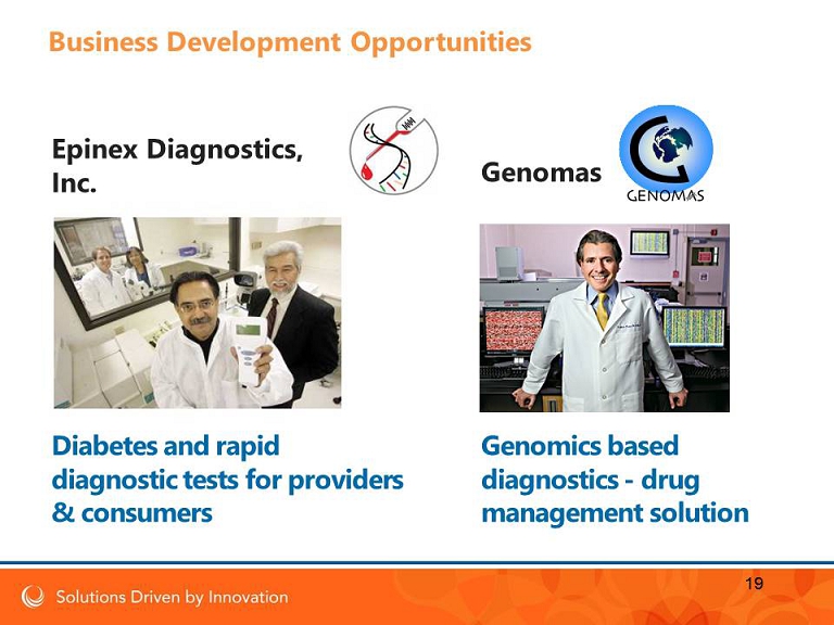 Epinex Diagnostics, Inc. Genomas Genomics based diagnostics - drug management solution Diabetes and rapid diagnostic tests for providers & consumers 19 Business Development Opportunities