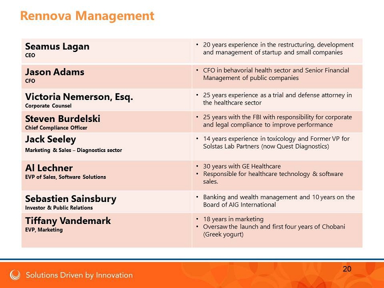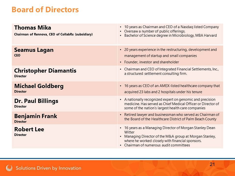 Seamus Lagan CEO • 20 years experience in the restructuring, development and management of startup and small companies Jason Adams CFO • CFO in behavorial health sector and Senior Financial Management of public companies Victoria Nemerson, Esq. Corporate Counsel • 25 years experience as a trial and defense attorney in the healthcare sector Steven Burdelski Chief Compliance Officer • 25 years with the FBI with responsibility for corporate and legal compliance to improve performance Jack Seeley Marketing & Sales – Diagnostics sector • 14 years experience in toxicology and Former VP for Solstas Lab Partners (now Quest Diagnostics) Al Lechner EVP of Sales, Software Solutions • 30 years with GE Healthcare • Responsible for healthcare technology & software sales. Sebastien Sainsbury Investor & Public Relations • Banking and wealth management and 10 years on the Board of AIG International Tiffany Vandemark EVP, Marketing • 18 years in marketing • Oversaw the launch and first four years of Chobani (Greek yogurt) 20 Rennova Management