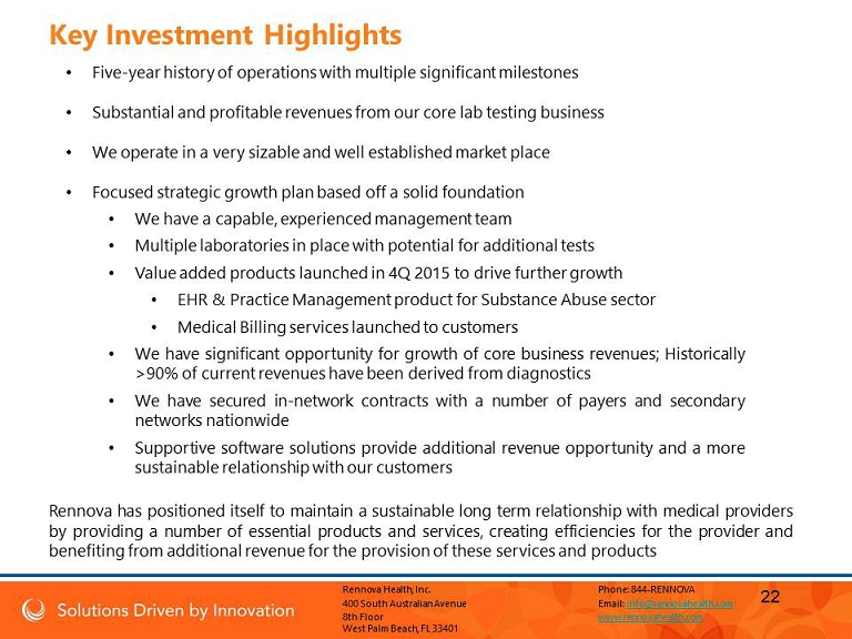 Rennova Health, Inc. Phone: 844 - RENNOVA 400 South Australian Avenue Email: info@rennovahealth.com 8th Floor www.rennovahealth.com West Palm Beach, FL 33401 22 Key Investment Highlights • Five - year history of operations with multiple significant milestones • Substantial and profitable revenues from our core lab testing business • We operate in a very sizable and well established market place • Focused strategic growth plan based off a solid foundation • We have a capable, experienced management team • Multiple laboratories in place with potential for additional tests • Value added products launched in 4 Q 2015 to drive further growth • EHR & Practice Management product for Substance Abuse sector • Medical Billing services launched to customers • We have significant opportunity for growth of core business revenues ; Historically > 90 % of current revenues have been derived from diagnostics • We have secured in - network contracts with a number of payers and secondary networks nationwide • Supportive software solutions provide additional revenue opportunity and a more sustainable relationship with our customers Rennova has positioned itself to maintain a sustainable long term relationship with medical providers by providing a number of essential products and services, creating efficiencies for the provider and benefiting from additional revenue for the provision of these services and products