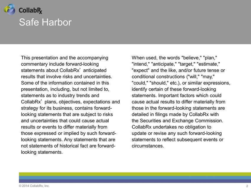 © 2014 CollabRx, Inc. 2 Safe Harbor When used, the words "believe," "plan," "intend," "anticipate," "target," "estimate," "expect" and the like, and/or future tense or conditional constructions ("will," "may," "could," "should," etc.), or similar expressions, identify certain of these forward - looking statements. Important factors which could cause actual results to differ materially from those in the forward - looking statements are detailed in filings made by CollabRx with the Securities and Exchange Commission. CollabRx undertakes no obligation to update or revise any such forward - looking statements to reflect subsequent events or circumstances. This presentation and the accompanying commentary include forward - looking statements about CollabRx ’ anticipated results that involve risks and uncertainties. Some of the information contained in this presentation, including, but not limited to, statements as to industry trends and CollabRx ’ plans, objectives, expectations and strategy for its business, contains forward - looking statements that are subject to risks and uncertainties that could cause actual results or events to differ materially from those expressed or implied by such forward - looking statements. Any statements that are not statements of historical fact are forward - looking statements.