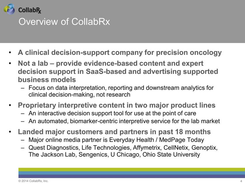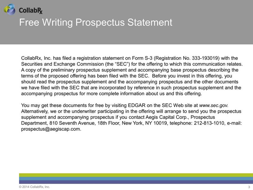 © 2014 CollabRx, Inc. 3 Free Writing Prospectus Statement CollabRx , Inc. has filed a registration statement on Form S - 3 (Registration No. 333 - 193019) with the Securities and Exchange Commission (the “SEC”) for the offering to which this communication relates. A copy of the preliminary prospectus supplement and accompanying base prospectus describing the terms of the proposed offering has been filed with the SEC. Before you invest in this offering, you should read the prospectus supplement and the accompanying prospectus and the other documents we have filed with the SEC that are incorporated by reference in such prospectus supplement and the accompanying prospectus for more complete information about us and this offering. You may get these documents for free by visiting EDGAR on the SEC Web site at www.sec.gov. Alternatively, we or the underwriter participating in the offering will arrange to send you the prospectus supplement and accompanying prospectus if you contact Aegis Capital Corp., Prospectus Department, 810 Seventh Avenue, 18th Floor, New York, NY 10019, telephone: 212 - 813 - 1010, e - mail: prospectus@aegiscap.com.