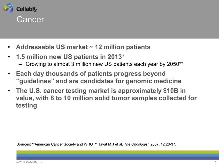 Overview of CollabRx • A clinical decision - support company for precision oncology • Not a lab – provide evidence - based content and expert decision support in SaaS - based and advertising supported business models – Focus on data interpretation, reporting and downstream analytics for clinical decision - making, not research • P roprietary interpretive content in two major product lines – An interactive decision support tool for use at the point of care – An automated, biomarker - centric interpretive service for the lab market • Landed major customers and partners in past 18 months – Major online media partner is Everyday Health / MedPage Today – Quest Diagnostics, Life Technologies, Affymetrix , CellNetix, Genoptix , The Jackson Lab, Sengenics , U Chicago, Ohio State University © 2014 CollabRx, Inc. 4