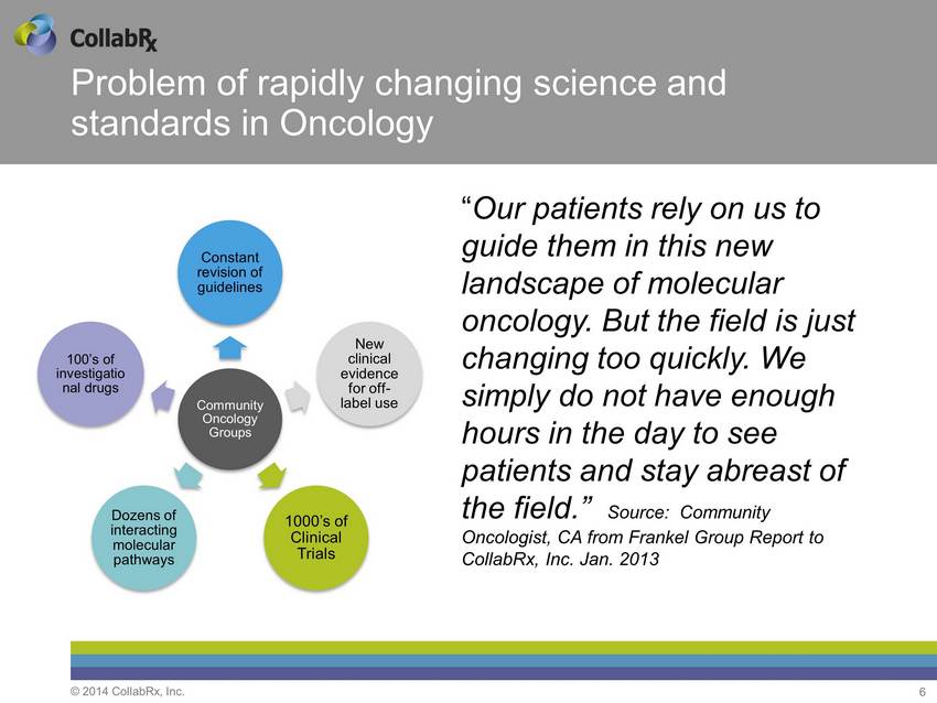 © 2014 CollabRx, Inc. 5 Cancer • Addressable US market ~ 12 million patients • 1.5 million new US patients in 2013* – Growing to almost 3 million new US patients each year by 2050** • Each day thousands of patients progress beyond “ guidelines” and are candidates for genomic medicine • The U.S. cancer testing market is approximately $10B in value, with 8 to 10 million solid tumor samples collected for testing Sources: **American Cancer Society and WHO ** Hayat M J et al. The Oncologist , 2007, 12:20 - 37.