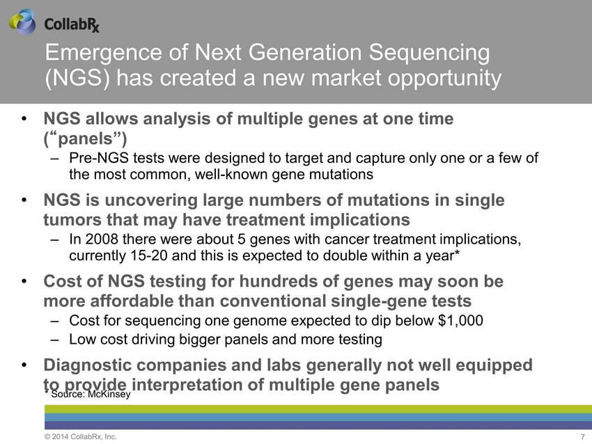 Problem of rapidly changing science and standards in Oncology © 2014 CollabRx, Inc. 6 Community Oncology Groups Constant revision of guidelines New clinical evidence for off - label use 1000’s of Clinical Trials Dozens of interacting molecular pathways 100’s of investigatio nal drugs “ Our patients rely on us to guide them in this new landscape of molecular oncology. But the field is just changing too quickly. We simply do not have enough hours in the day to see patients and stay abreast of the field. ” Source: Community Oncologist, CA from Frankel Group Report to CollabRx, Inc. Jan. 2013