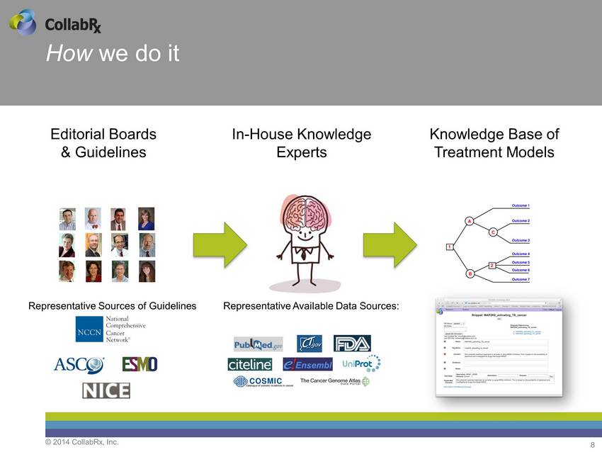 © 2014 CollabRx, Inc. 7 Emergence of Next Generation Sequencing (NGS ) has created a new market opportunity * Source: McKinsey • NGS allows analysis of multiple genes at one time ( “ panels”) – Pre - NGS tests were designed to target and capture only one or a few of the most common, well - known gene mutations • NGS is uncovering large numbers of mutations in single tumors that may have treatment implications – In 2008 there were about 5 genes with cancer treatment implications, currently 15 - 20 and this is expected to double within a year* • Cost of NGS testing for hundreds of genes may soon be more affordable than conventional single - gene tests – Cost for sequencing one genome expected to dip below $ 1,000 – Low cost driving bigger panels and more testing • Diagnostic companies and labs generally not well equipped to provide interpretation of multiple gene panels