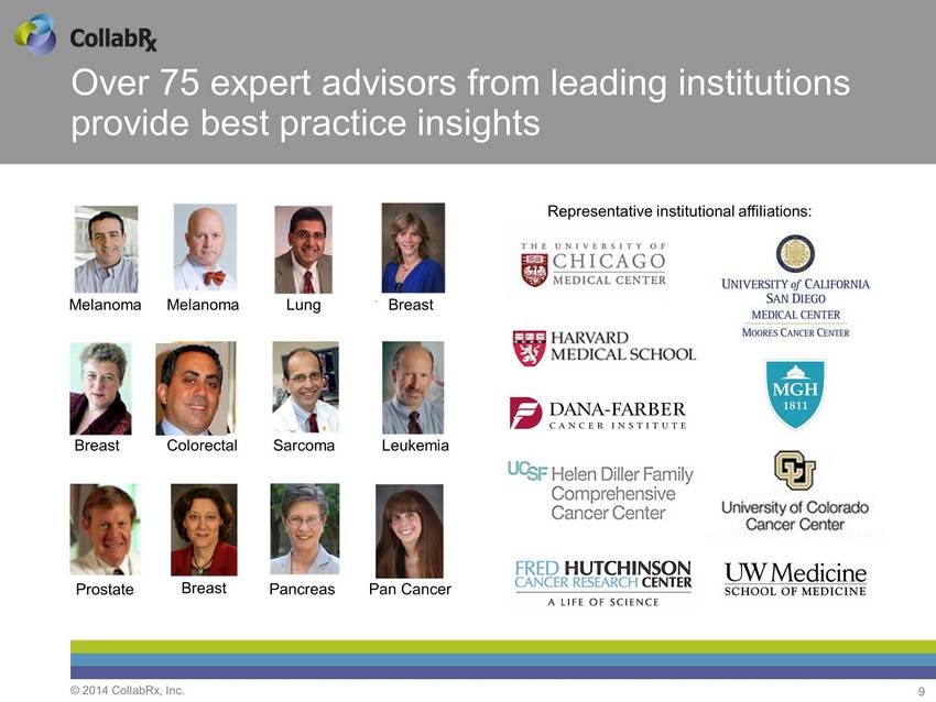9 Melanoma Melanoma Lung Breast Breast Colorectal Sarcoma Leukemia Prostate Pancreas Pan Cancer Breast Over 75 expert advisors from leading institutions provide best practice insights R epresentative institutional affiliations: © 2014 CollabRx, Inc.