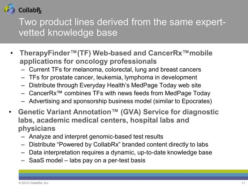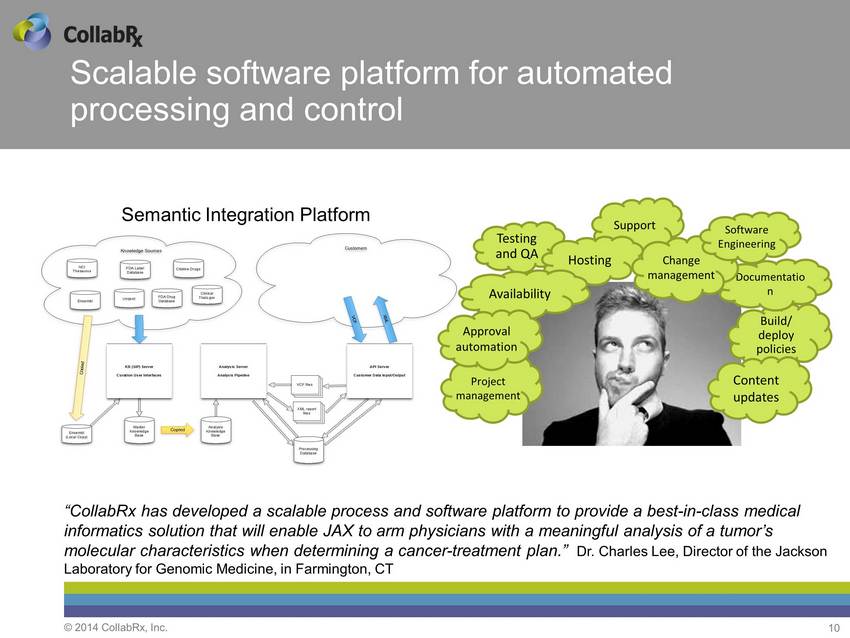 Testing and QA Project management Support Build/ deploy policies Content updates Hosting Availability Documentatio n Approval automation Change management Software Engineering Scalable software platform for automated processing and control Knowledge Sources Master Knowledge Base NCI Thesaurus KB (SIP) Server Curation User Interfaces FDA Label Database FDA Drug Database Citeline Drugs Clinical Trials.gov Analysis Server Analysis Pipeline Analysis Knowledge Base Co p ied Processing Database API Server Customer Data Input/Output VCF les XML report les Customers V C F X M L Ensembl (Local Copy) Ensembl C o p i e d Architecture Overview Uniprot Semantic Integration Platform © 2014 CollabRx, Inc. 10 “CollabRx has developed a scalable process and software platform to provide a best - in - class medical informatics solution that will enable JAX to arm physicians with a meaningful analysis of a tumor’s molecular characteristics when determining a cancer - treatment plan. ” Dr . Charles Lee, Director of the Jackson Laboratory for Genomic Medicine, in Farmington, CT