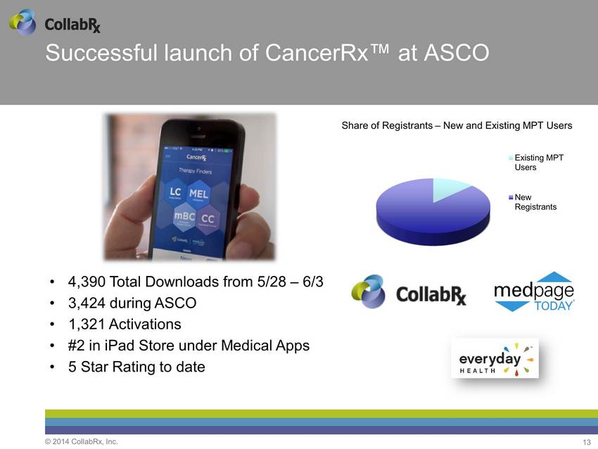 13 Successful launch of CancerRx™ at ASCO © 2014 CollabRx, Inc. • 4,390 Total Downloads from 5/28 – 6/3 • 3,424 during ASCO • 1,321 Activations • #2 in i P ad Store under Medical Apps • 5 Star Rating to date Existing MPT Users New Registrants Share of Registrants – New and Existing MPT Users