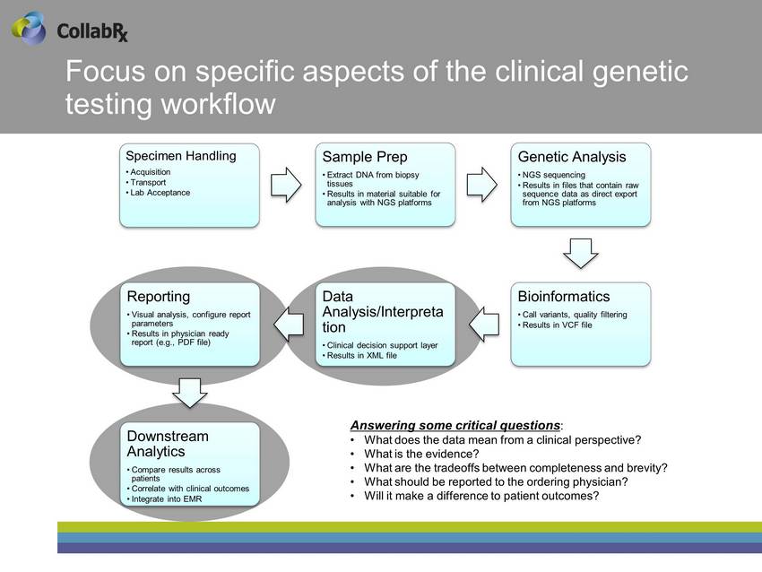 Specimen Handling • Acquisition • Transport • Lab Acceptance Sample Prep • Extract DNA from biopsy tissues • Results in material suitable for analysis with NGS platforms Genetic Analysis • NGS sequencing • Results in files that contain raw sequence data as direct export from NGS platforms Bioinformatics • Call variants, quality filtering • Results in VCF file Data Analysis/Interpreta tion • Clinical decision support layer • Results in XML file Reporting • Visual analysis, configure report parameters • Results in physician ready report (e.g., PDF file) Downstream Analytics • Compare results across patients • Correlate with clinical outcomes • Integrate into EMR Focus on specific aspects of the clinical g enetic t esting w orkflow Answering some critical questions : • What does the data mean from a clinical perspective? • What is the evidence? • What are the tradeoffs between completeness and brevity? • What should be reported to the ordering physician? • Will it make a difference to patient outcomes?