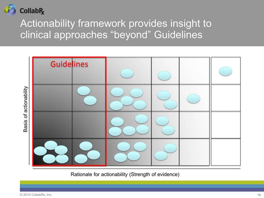 © 2014 CollabRx, Inc. 16 Rationale for actionability (Strength of evidence) Basis of actionability Guidelines Actionability framework provides insight to clinical approaches “beyond” Guidelines