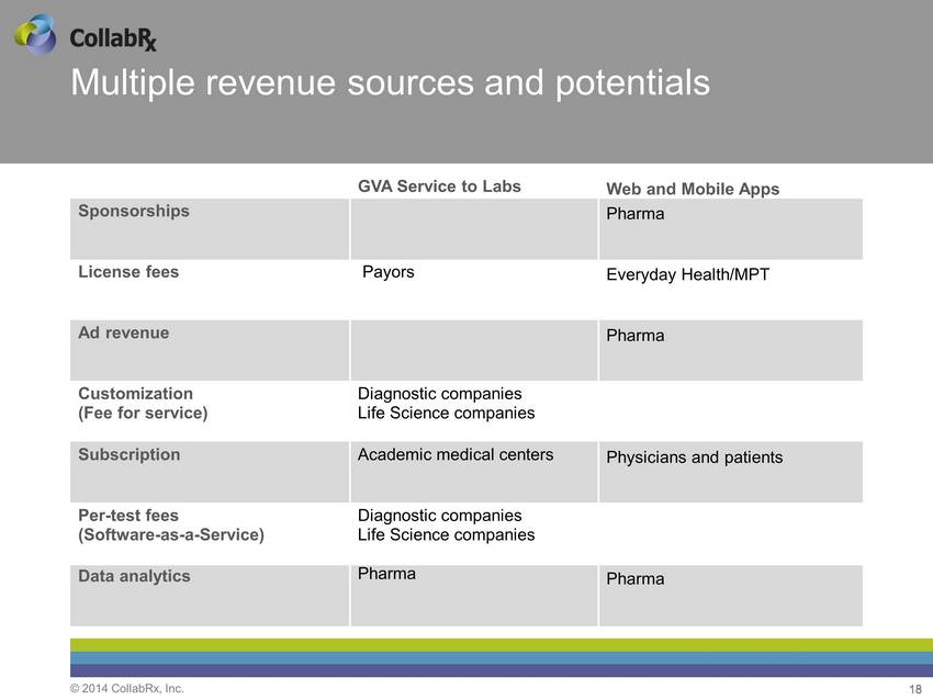 17 Partnerships, strategic alliances, customers and sponsors © 2014 CollabRx, Inc. 17 Academic Institutions Cancer Centers Professional Organizations University of Chicago Ohio State University Jackson Laboratory Stanford Hospitals OncoSolutions Cancer Center (Singapore) American Society of Clinical Oncology (ASCO) College of American Pathologists (CAP) Diagnostic Labs Genomic Analysis Companies Quest Diagnostics Affymetrix Life Technologies Genoptix Cellnetix Cynvenio Biosystems OncoDNA Sengenics Online Media Healthcare IT Everyday Health Medpage Today GeneInsight Projects in Knowledge Pharma / Biotech GSK Pfizer Boehringer Ingelheim