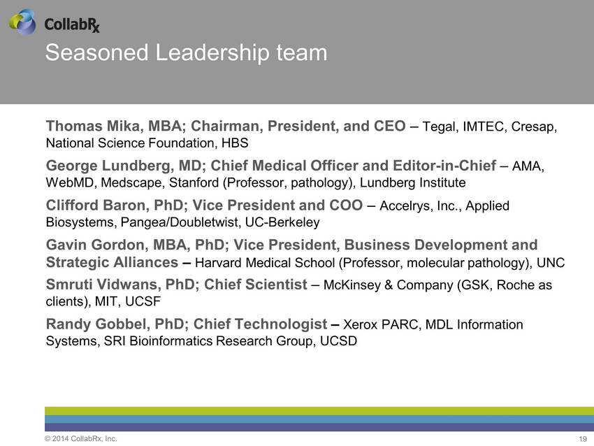 18 © 2014 CollabRx, Inc. 18 Multiple revenue sources and potentials Web and Mobile Apps Pharma Everyday Health/MPT Pharma Physicians and patients Pharma Sponsorships License fees Ad revenue Customization (Fee for service) Subscription Per - test fees (Software - as - a - Service) D ata analytics GVA Service to Labs Payors Diagnostic companies Life Science companies Academic medical centers Diagnostic companies Life Science companies Pharma