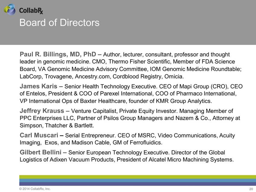 © 2014 CollabRx, Inc. 19 Seasoned Leadership team Thomas Mika, MBA; Chairman, President, and CEO – Tegal, IMTEC, Cresap, National Science Foundation, HBS George Lundberg, MD; Chief Medical Officer and Editor - in - Chief – AMA, WebMD, Medscape, Stanford (Professor, pathology), Lundberg Institute Clifford Baron, PhD; Vice President and COO – Accelrys, Inc., Applied Biosystems, Pangea/Doubletwist, UC - Berkeley Gavin Gordon, MBA, PhD; Vice President, Business Development and Strategic Alliances – Harvard Medical School (Professor , molecular pathology ), UNC Smruti Vidwans, PhD; Chief Scientist – McKinsey & Company (GSK, Roche as clients) , MIT, UCSF Randy Gobbel, PhD; Chief Technologist – Xerox PARC, MDL Information Systems, SRI Bioinformatics Research Group, UCSD