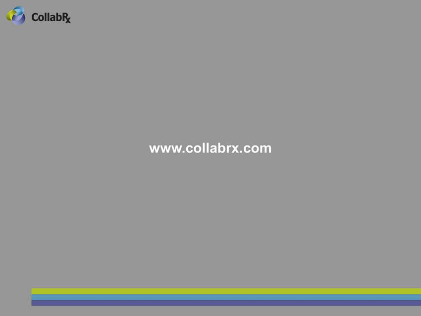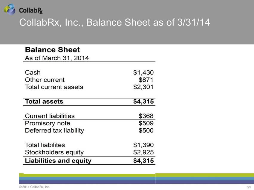 © 2014 CollabRx, Inc. 20 Board of Directors Paul R. Billings, MD, PhD – Author, lecturer, consultant, professor and thought leader in genomic medicine. CMO, Thermo Fisher Scientific , Member of FDA Science Board, VA Genomic Medicine Advisory Committee, IOM Genomic Medicine Roundtable; LabCorp , Trovagene , Ancestry.com , Cordblood Registry, Omicia . James Karis – Senior Health Technology Executive. CEO of Mapi Group (CRO), CEO of Entelos , President & COO of Parexel International, COO of Pharmaco International, VP International Ops of Baxter Healthcare, founder of KMR Group Analytics. Jeffrey Krauss – Venture Capitalist, Private Equity Investor. Managing Member of PPC Enterprises LLC, Partner of Psilos Group Managers and Nazem & Co., Attorney at Simpson, Thatcher & Bartlett. Carl Muscari – S erial Entrepreneur. CEO of MSRC, Video Communications, Acuity Imaging, Exos , and Madison Cable, GM of Ferrofluidics . Gilbert Bellini – S enior European Technology Executive. Director of the Global Logistics of Adixen Vacuum Products, President of Alcatel Micro Machining Systems.