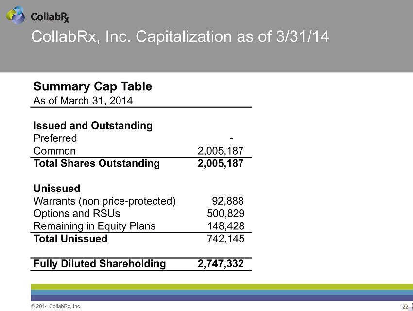 21 © 2014 CollabRx, Inc. 21 CollabRx, Inc ., Balance Sheet as of 3/31/14 Cash $1,430 Other current $871 Total current assets $2,301 Total assets $4,315 Current liabilities $368 Promisory note $509 Deferred tax liability $500 Total liabilites $1,390 Stockholders equity $2,925 Liabilities and equity $4,315 As of March 31, 2014 Balance Sheet