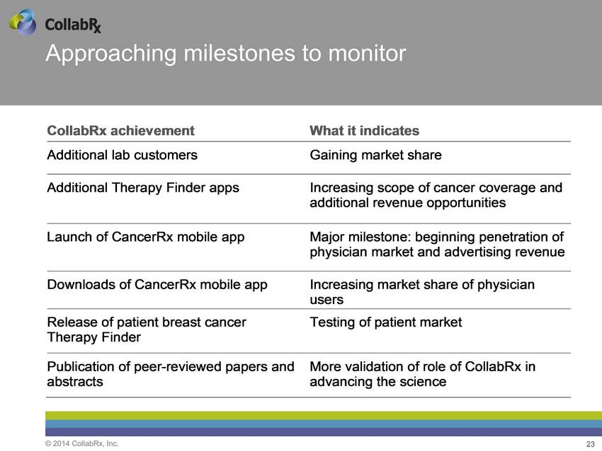 22 © 2014 CollabRx, Inc. 22 CollabRx, Inc . Capitalization as of 3/ 31/ 14 Issued and Outstanding Preferred - Common 2,005,187 Total Shares Outstanding 2,005,187 Unissued Warrants (non price-protected) 92,888 Options and RSUs 820,397 Remaining in Equity Plans 148,428 Total Unissued 1,061,713 Fully Diluted Shareholding 3,066,900 Summary Cap Table As of March 31, 2014