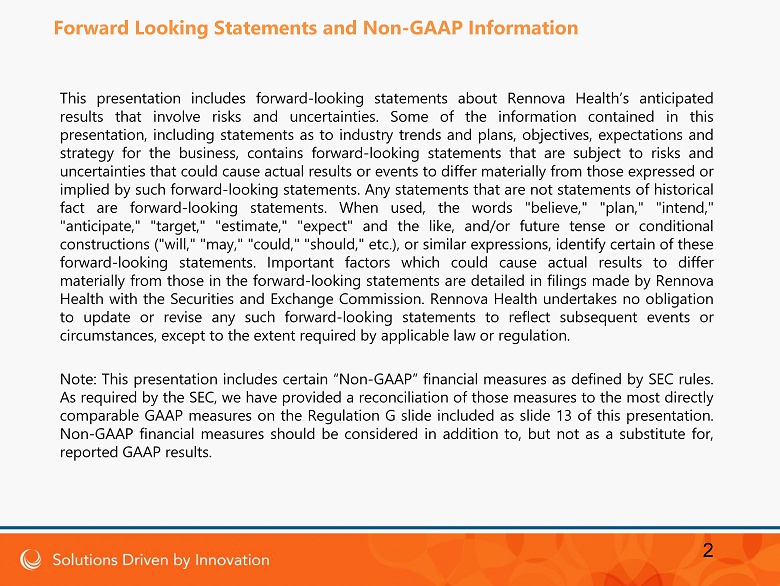 This presentation includes forward - looking statements about Rennova Health’s anticipated results that involve risks and uncertainties . Some of the information contained in this presentation, including statements as to industry trends and plans, objectives, expectations and strategy for the business, contains forward - looking statements that are subject to risks and uncertainties that could cause actual results or events to differ materially from those expressed or implied by such forward - looking statements . Any statements that are not statements of historical fact are forward - looking statements . When used, the words "believe," "plan," "intend," "anticipate," "target," "estimate," "expect" and the like, and/or future tense or conditional constructions ("will," "may," "could," "should," etc . ), or similar expressions, identify certain of these forward - looking statements . Important factors which could cause actual results to differ materially from those in the forward - looking statements are detailed in filings made by Rennova Health with the Securities and Exchange Commission . Rennova Health undertakes no obligation to update or revise any such forward - looking statements to reflect subsequent events or circumstances, except to the extent required by applicable law or regulation . Note : This presentation includes certain “Non - GAAP” financial measures as defined by SEC rules . As required by the SEC, we have provided a reconciliation of those measures to the most directly comparable GAAP measures on the Regulation G slide included as slide 13 of this presentation . Non - GAAP financial measures should be considered in addition to, but not as a substitute for, reported GAAP results . Forward Looking Statements and Non - GAAP Information 2