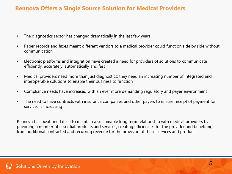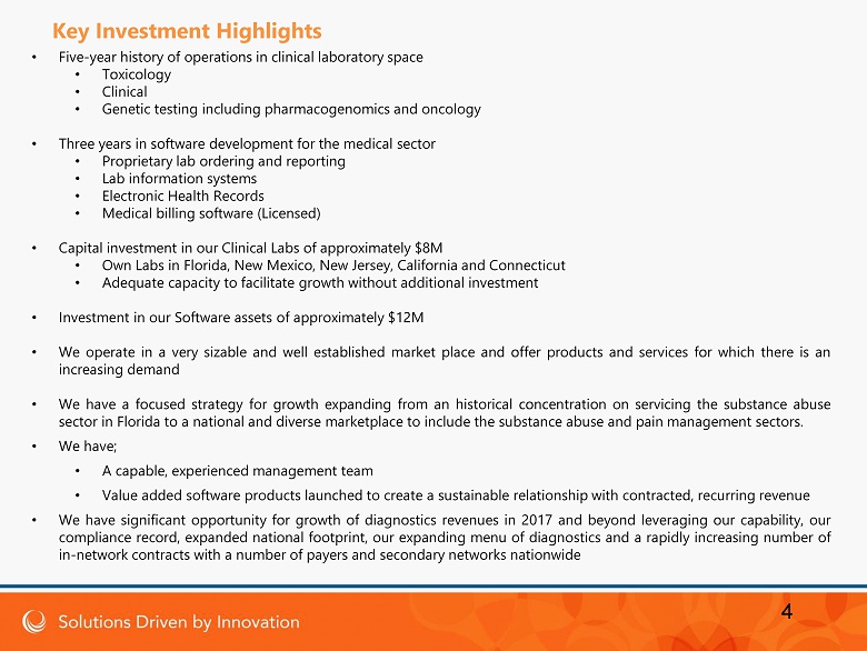 • Five - year history of operations in clinical laboratory space • Toxicology • Clinical • Genetic testing including pharmacogenomics and oncology • Three years in software development for the medical sector • Proprietary lab ordering and reporting • Lab information systems • Electronic Health Records • Medical billing software (Licensed) • Capital investment in our Clinical Labs of approximately $ 8 M • Own Labs in Florida, New Mexico, New Jersey, California and Connecticut • Adequate capacity to facilitate growth without additional investment • Investment in our Software assets of approximately $ 12 M • We operate in a very sizable and well established market place and offer products and services for which there is an increasing demand • We have a focused strategy for growth expanding from an historical concentration on servicing the substance abuse sector in Florida to a national and diverse marketplace to include the substance abuse and pain management sectors . • We have ; • A capable, experienced management team • Value added software products launched to create a sustainable relationship with contracted, recurring revenue • We have significant opportunity for growth of diagnostics revenues in 2017 and beyond leveraging our capability, our compliance record, expanded national footprint, our expanding menu of diagnostics and a rapidly increasing number of in - network contracts with a number of payers and secondary networks nationwide 4 Key Investment Highlights