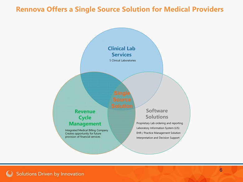 • The diagnostics sector has changed dramatically in the last few years • Paper records and faxes meant different vendors to a medical provider could function side by side without communication • Electronic platforms and integration have created a need for providers of solutions to communicate efficiently, accurately, automatically and fast • Medical providers need more than just diagnostics; they need an increasing number of integrated and interoperable solutions to enable their business to function • Compliance needs have increased with an ever more demanding regulatory and payer environment • The need to have contracts with insurance companies and other payers to ensure receipt of payment for services is increasing Rennova has positioned itself to maintain a sustainable long term relationship with medical providers by providing a number of essential products and services, creating efficiencies for the provider and benefiting from additional contracted and recurring revenue for the provision of these services and products 5 Rennova Offers a Single Source Solution for Medical Providers
