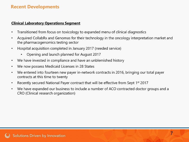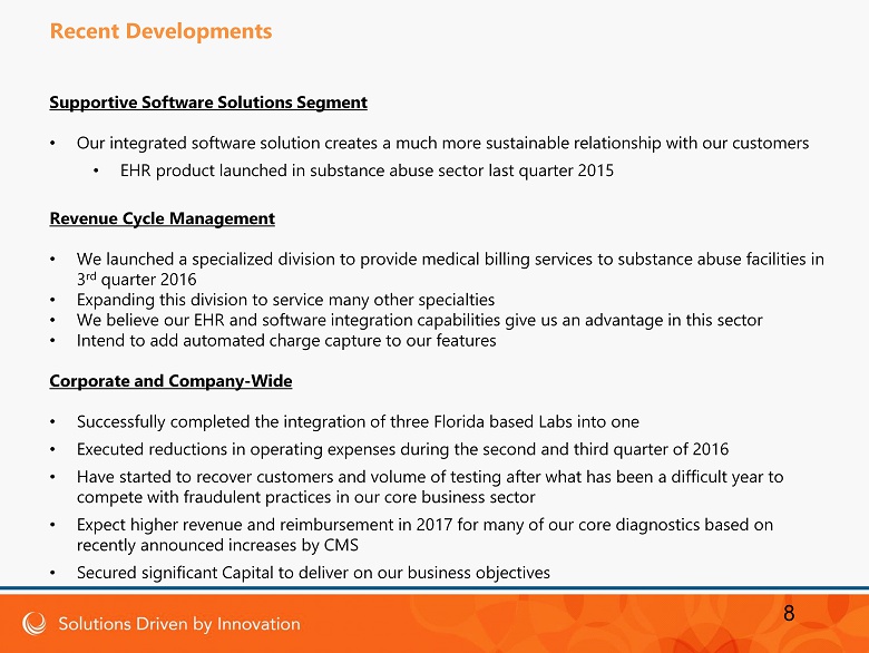Clinical Laboratory Operations Segment • Transitioned from focus on toxicology to expanded menu of clinical diagnostics • Acquired CollabRx and Genomas for their technology in the oncology interpretation market and the pharmacogenomics testing sector • Hospital acquisition completed in January 2017 (needed service) • Opening and launch planned for August 2017 • We have invested in c ompliance and have an unblemished history • We now possess Medicaid Licenses in 28 States • We entered into fourteen new payer in - network contracts in 2016, bringing our total payer contracts at this time to twenty • Recently secured National Payer contract that will be effective from Sept 1 st 2017 • We have expanded our business to include a number of ACO contracted doctor groups and a CRO (Clinical research organization) 7 Recent Developments
