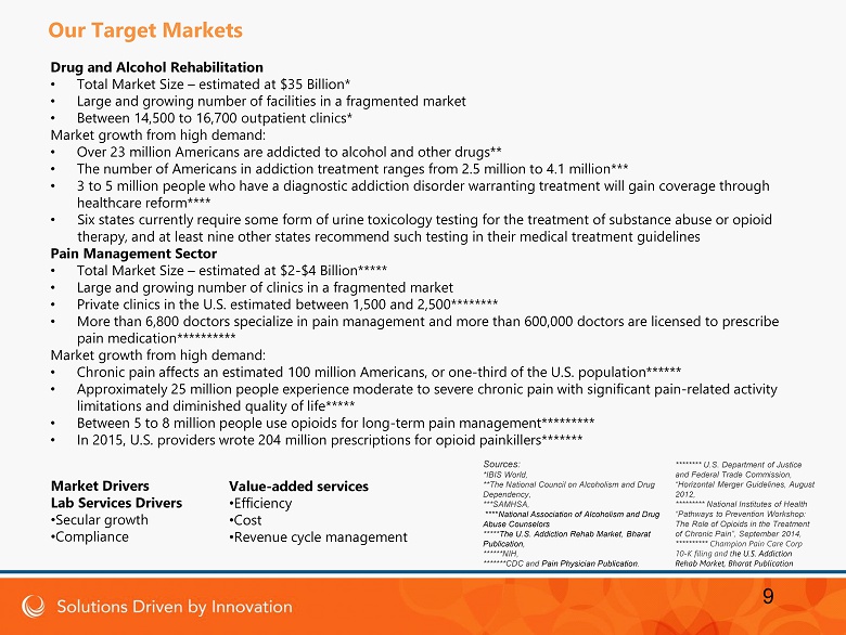 Drug and Alcohol Rehabilitation • Total Market Size – estimated at $35 Billion* • Large and growing number of facilities in a fragmented market • Between 14,500 to 16,700 outpatient clinics* Market growth from high demand: • Over 23 million Americans are addicted to alcohol and other drugs** • The number of Americans in addiction treatment ranges from 2.5 million to 4.1 million*** • 3 to 5 million people who have a diagnostic addiction disorder warranting treatment will gain coverage through healthcare reform**** • Six states currently require some form of urine toxicology testing for the treatment of substance abuse or opioid therapy, and at least nine other states recommend such testing in their medical treatment guidelines Pain Management Sector • Total Market Size – estimated at $2 - $4 Billion***** • Large and growing number of clinics in a fragmented market • Private clinics in the U.S. estimated between 1,500 and 2,500******** • More than 6,800 doctors specialize in pain management and more than 600,000 doctors are licensed to prescribe pain medication********** Market growth from high demand: • Chronic pain affects an estimated 100 million Americans, or one - third of the U.S. population****** • Approximately 25 million people experience moderate to severe chronic pain with significant pain - related activity limitations and diminished quality of life***** • Between 5 to 8 million people use opioids for long - term pain management********* • In 2015, U.S. providers wrote 204 million prescriptions for opioid painkillers******* Market Drivers Lab Services Drivers • Secular growth • Compliance Value - added services • Efficiency • Cost • Revenue cycle management Sources: *IBIS World, **The National Council on Alcoholism and Drug Dependency , ***SAMHSA, **** National Association of Alcoholism and Drug Abuse Counselors ***** The U.S. Addiction Rehab Market, Bharat Publication, ******NIH, *******CDC and Pain Physician Publication . 9 Our Target Markets ******** U.S. Department of Justice and Federal Trade Commission, “Horizontal Merger Guidelines, August 2012, ********* National Institutes of Health “Pathways to Prevention Workshop: The Role of Opioids in the Treatment of Chronic Pain”, September 2014, ********** Champion Pain Care Corp 10 - K filing and t he U.S. Addiction Rehab Market, Bharat Publication