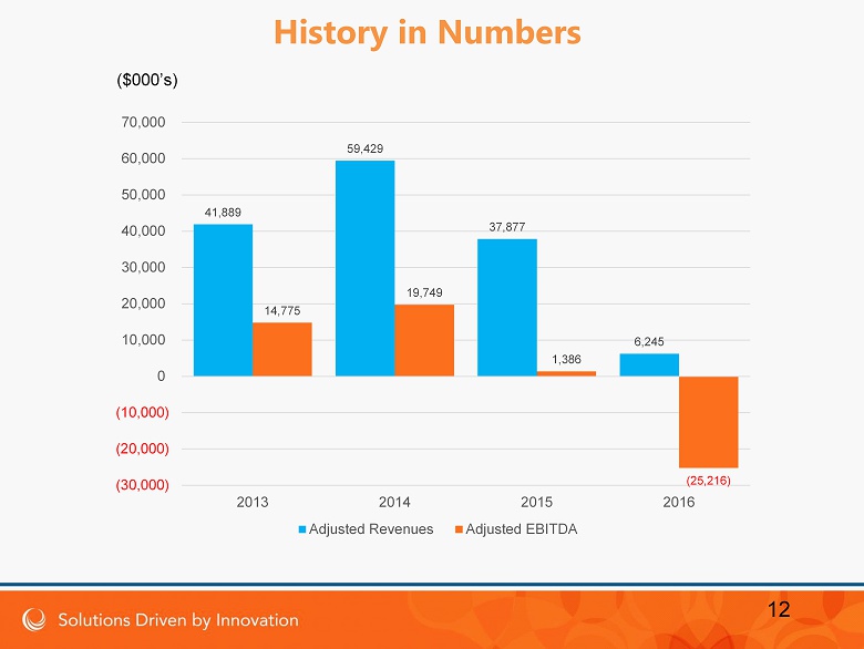 12 History in Numbers 41,889 59,429 37,877 6,245 14,775 19,749 1,386 (25,216) (30,000) (20,000) (10,000) 0 10,000 20,000 30,000 40,000 50,000 60,000 70,000 2013 2014 2015 2016 Adjusted Revenues Adjusted EBITDA ($000’s)