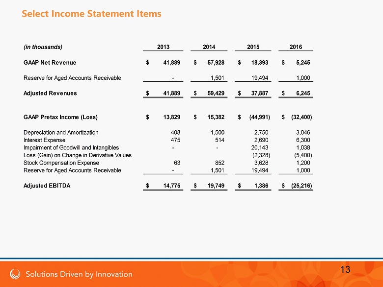 13 Select Income Statement Items (in thousands) 2013 2014 2015 2016 GAAP Net Revenue 41,889$ 57,928$ 18,393$ 5,245$ Reserve for Aged Accounts Receivable - 1,501 19,494 1,000 Adjusted Revenues 41,889$ 59,429$ 37,887$ 6,245$ GAAP Pretax Income (Loss) 13,829$ 15,382$ (44,991)$ (32,400)$ Depreciation and Amortization 408 1,500 2,750 3,046 Interest Expense 475 514 2,690 6,300 Impairment of Goodwill and Intangibles - - 20,143 1,038 Loss (Gain) on Change in Derivative Values (2,328) (5,400) Stock Compensation Expense 63 852 3,628 1,200 Reserve for Aged Accounts Receivable - 1,501 19,494 1,000 Adjusted EBITDA 14,775$ 19,749$ 1,386$ (25,216)$
