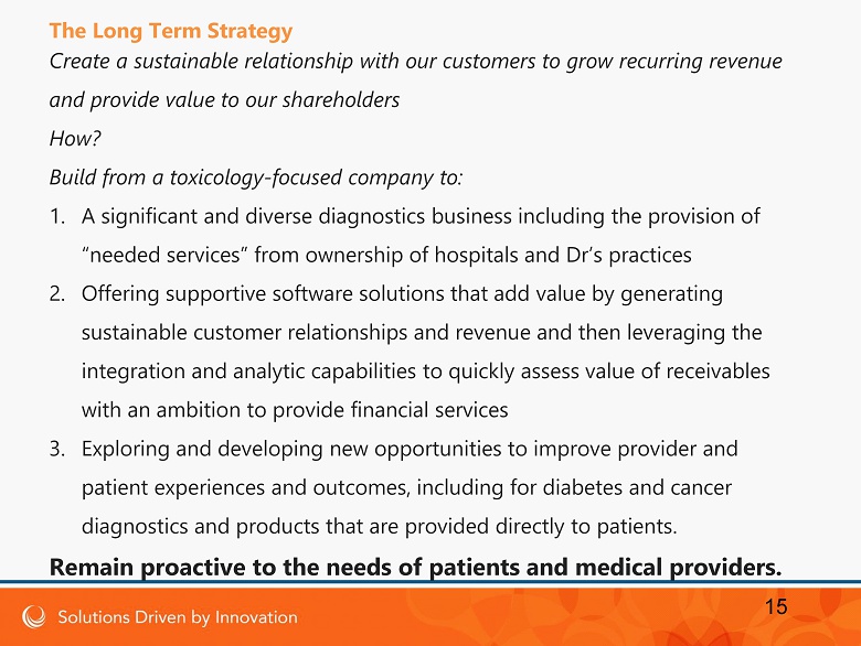 Create a sustainable relationship with our customers to grow recurring revenue and provide value to our shareholders How? Build from a toxicology - focused company to: 1. A significant and diverse diagnostics business including the provision of “needed services” from ownership of hospitals and Dr’s practices 2. Offering supportive software solutions that add value by generating sustainable customer relationships and revenue and then leveraging the integration and analytic capabilities to quickly assess value of receivables with an ambition to provide financial services 3. Exploring and developing new opportunities to improve provider and patient experiences and outcomes, including for diabetes and cancer diagnostics and products that are provided directly to patients . Remain proactive to the needs of patients and medical providers. 15 The Long Term Strategy